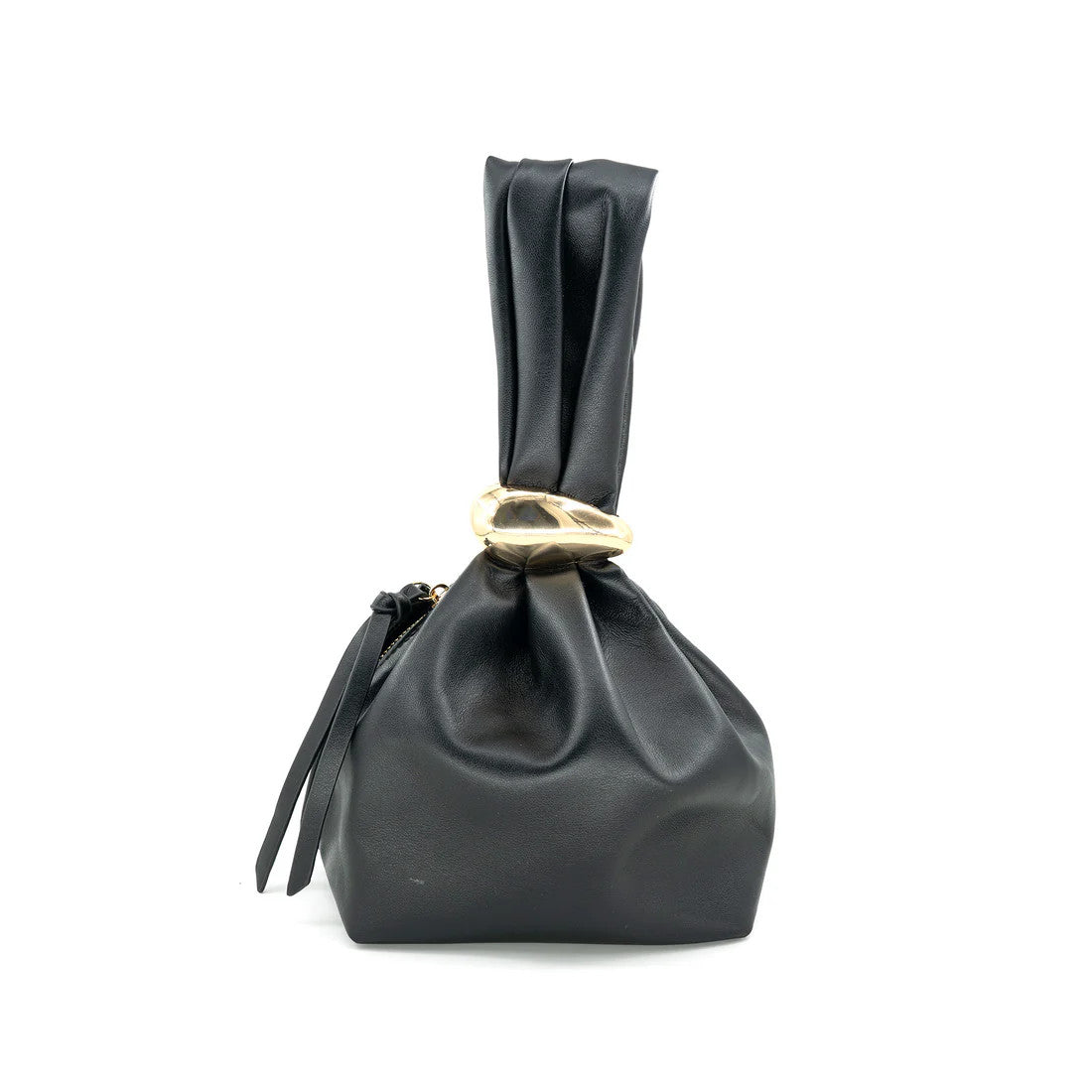 Crafted in smooth faux leather, this sculptural bag features a unique knotted handle detail cinched with a bold gold accent, creating a striking silhouette that stands out effortlessly.