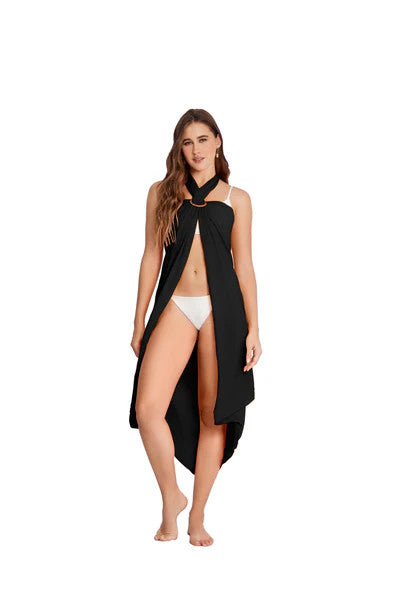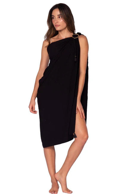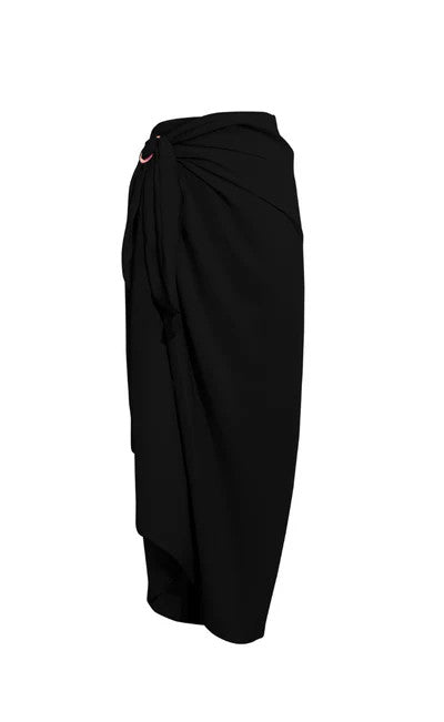 A classic black pareo designed with a sleek wrap silhouette and side ring detail. Lightweight and easy to style, it drapes effortlessly with a flattering high slit. Perfect for beach days, poolside lounging, or layered over swimwear for a polished resort look.
