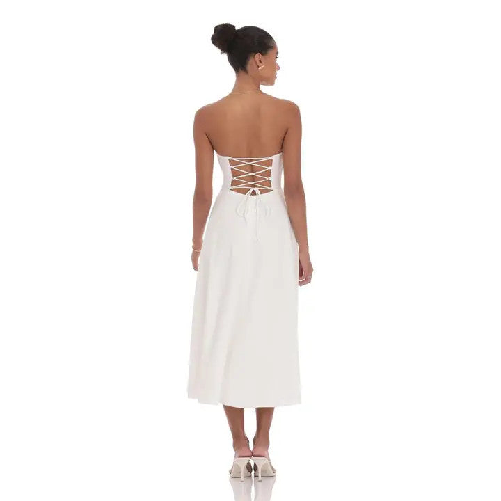 Soft, romantic, and effortlessly elegant. This strapless midi dress features a flattering sweetheart neckline with delicate lace trim and a structured bodice for a beautifully sculpted fit. The open back is finished with an adjustable lace-up corset detail, allowing for a custom fit while adding a subtle statement moment. Flowing into an airy A-line skirt, this dress moves gracefully with every step. Perfect for bridal showers, engagement celebrations, summer soirées, or any occasion that calls for timeless femininity.
