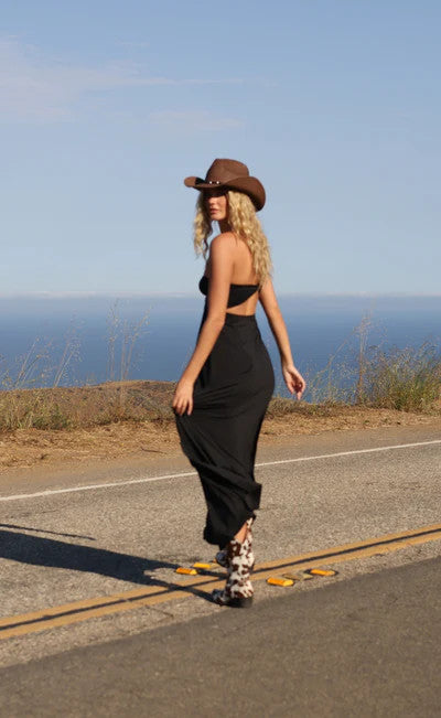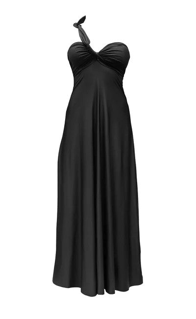 A sleek black one-shoulder maxi dress with a softly gathered bodice and effortless drape. Designed to flatter with a clean, flowing silhouette and a subtle shoulder tie detail. Perfect for formal events, evenings out, or any elevated occasion.