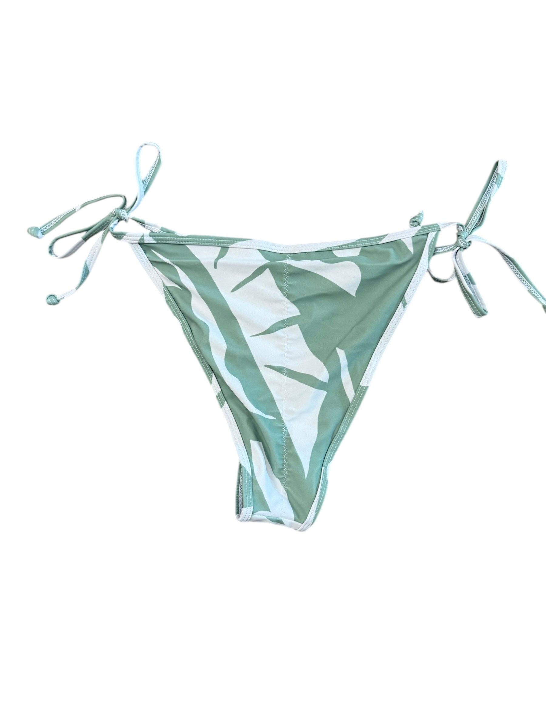 Embrace the allure of tropical elegance with our Sage Leaf Bikini Set. This exquisite two-piece ensemble features a triangle-style tie top adorned with sage and white hues. The adjustable ties at the neck and back ensure a customizable fit, providing both comfort and support. The matching bikini bottoms complete the set, offering a chic and coordinated look perfect for beach outings or poolside relaxation. Crafted from high-quality materials, this bikini set combines style and functionality, making it a must-have addition to your swimwear collection.
