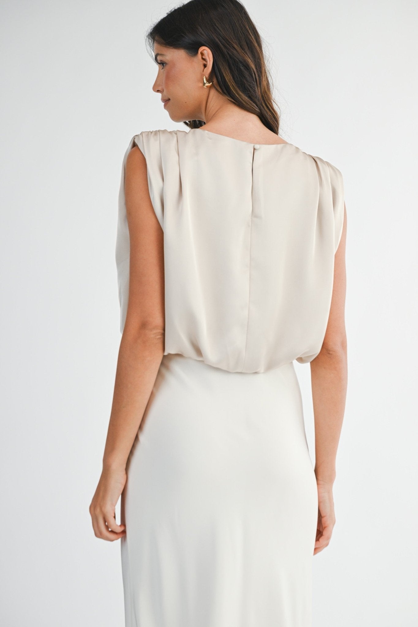 This sleeveless solid satin crop top features a gathered drape shoulder detail that gives it a soft, elegant shape. Designed with a smooth lining for comfort and a flattering fit, it’s finished with a back invisible zipper for easy wear.
