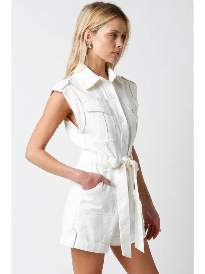 Effortless, structured, and endlessly wearable, this utility-inspired romper is a warm-weather essential. Designed with a crisp collared neckline, button-front closure, and functional pockets, it cinches at the waist with an adjustable tie for a flattering, easy fit. The sleeveless silhouette keeps it cool and polished, perfect for daytime plans, travel days, or styled up with statement accessories.