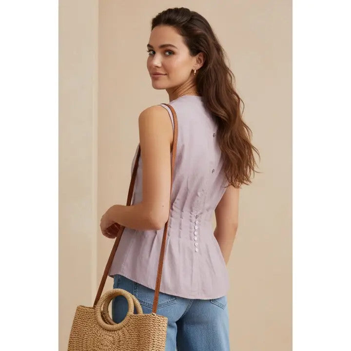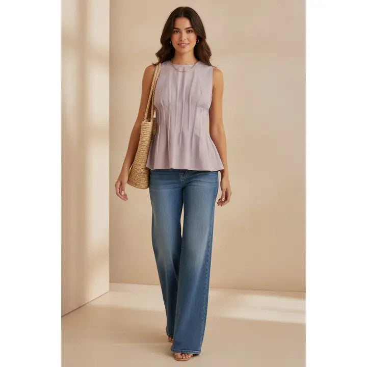 The pleated detailing through the bodice creates subtle shape while enhancing the flattering silhouette. Designed with a peplum hem, the top gently flares at the waist for a polished, feminine finish. The sleeveless design and classic round neckline keep the look clean and versatile, while the button detail at the back adds a delicate, unexpected touch.