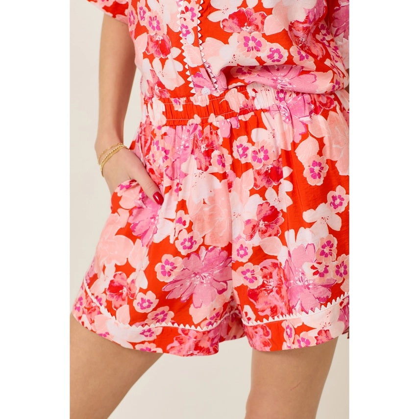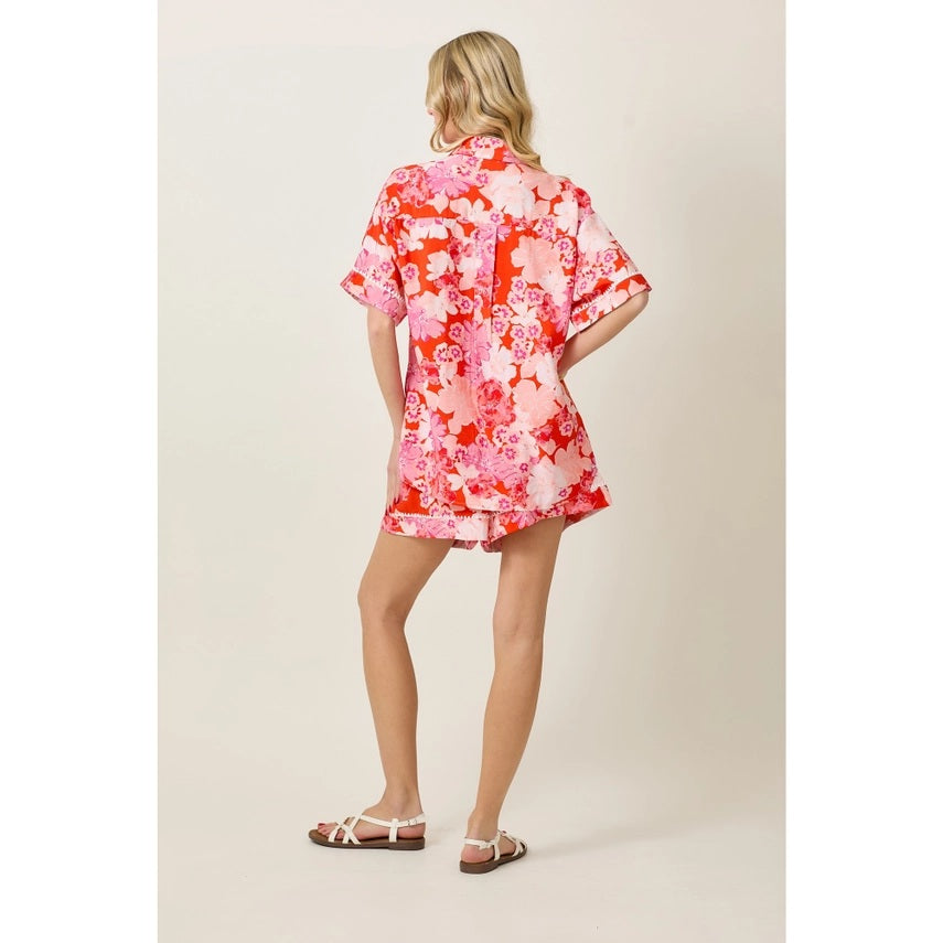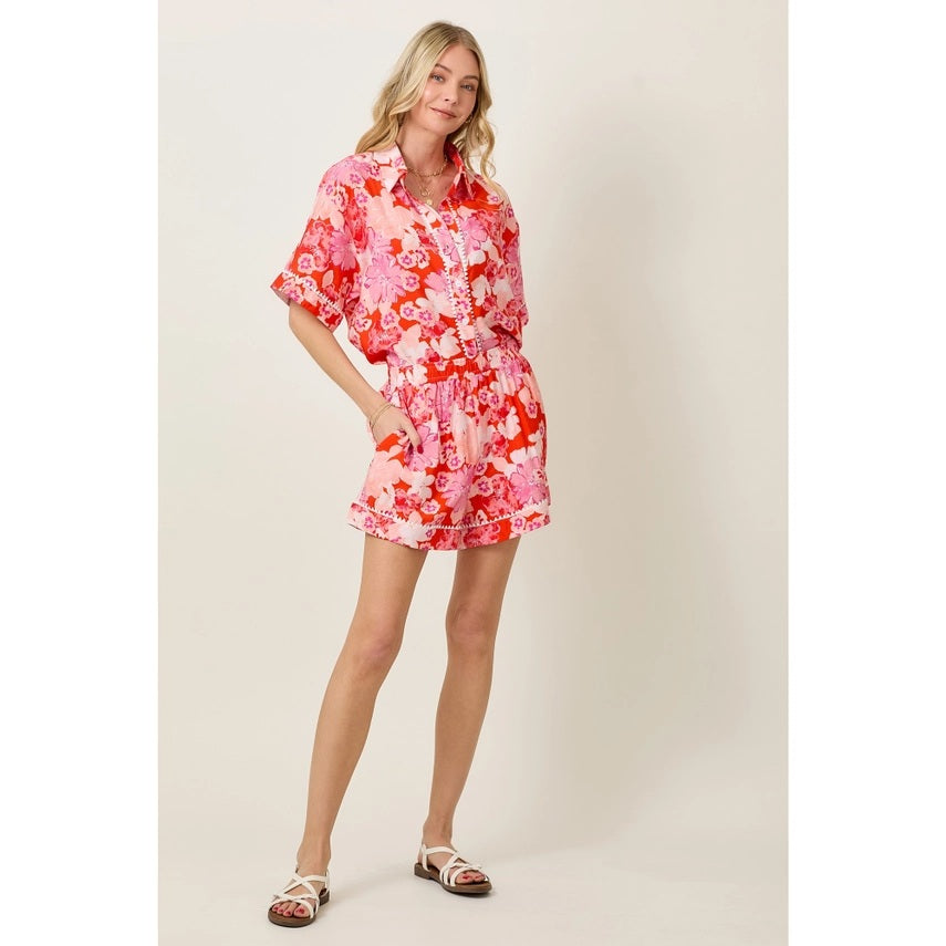 Our Rio Floral Button Shirt Shorts set is the perfect summer outfit. It has a comfortable relaxed fit, short sleeves with decorative trim, elastacized waist & pockets.
