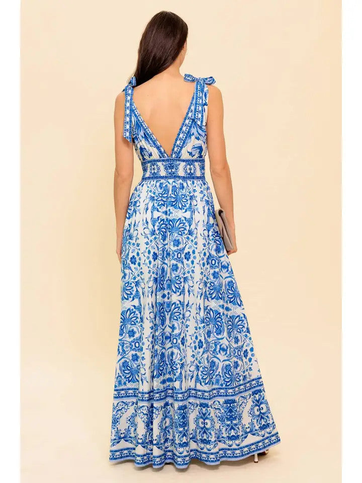 Effortlessly elegant with a coastal soul, this blue-and-white maxi dress is made for sun-drenched days and warm nights. Designed with a flattering deep V neckline, adjustable tie straps, and a smocked waist that defines your shape without feeling restrictive. The flowy tiered skirt moves beautifully with every step, while the intricate porcelain-inspired print adds a timeless Mediterranean feel.