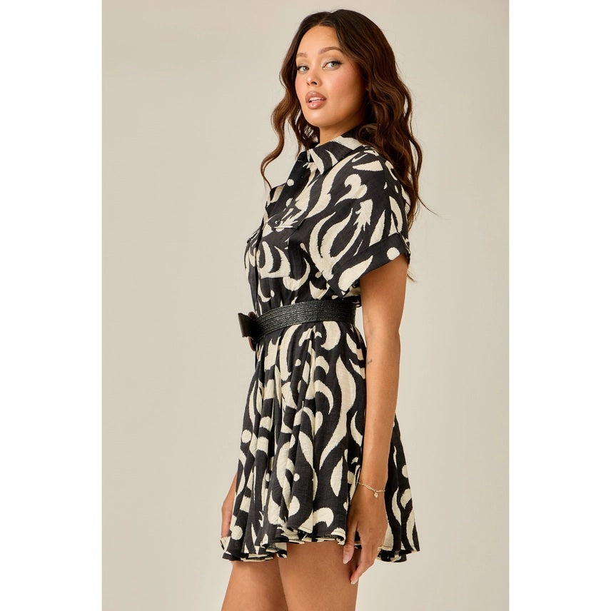 Meet your new wardrobe power move: the Belted Abstract Shirt Dress. This flirty mini dress takes the classic shirt silhouette and gives it a fierce, fashion-forward twist with a bold abstract print and a waist-defining belt. The collared neckline and cuffed sleeves keep things effortlessly polished, while the flared skirt adds just the right amount of sass. Pair it with sandals or heels, either way, you'll be turning heads.