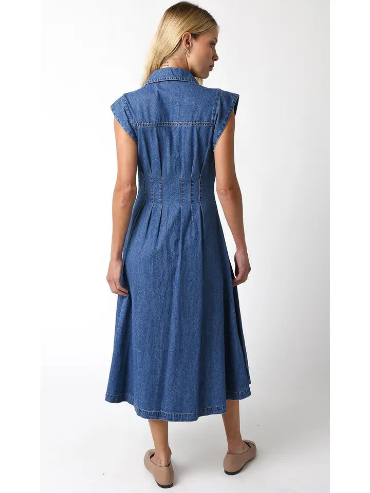 Classic denim with a feminine twist, this button-down midi dress is an effortless go-to for any season. Designed with a flattering collared neckline, cap sleeves, and a softly pleated skirt, it cinches beautifully at the waist while offering easy movement throughout. The lightweight denim fabric gives it structure without feeling heavy, making it perfect for everyday wear, brunch dates, or casual nights out.