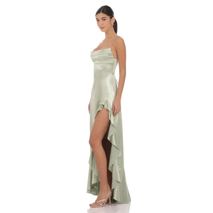 This satin maxi gown features a flattering draped cowl neckline, delicate adjustable spaghetti straps, and a smooth, body-skimming silhouette that beautifully highlights your shape. Crafted from silky satin and fully lined for a comfortable, seamless fit.