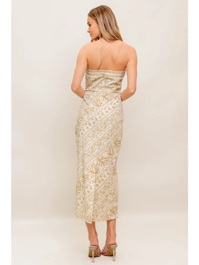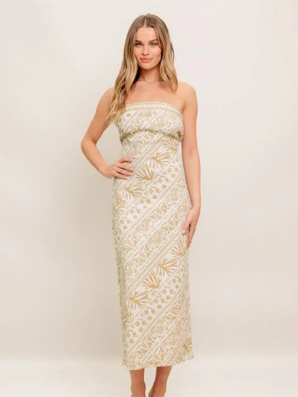 The perfect blend of boho charm and elevated simplicity. Featuring a beautifully detailed woven print in soft cream and warm gold tones, this strapless silhouette drapes seamlessly for a flattering, elongating fit. The elasticized bandeau neckline ensures secure comfort.
