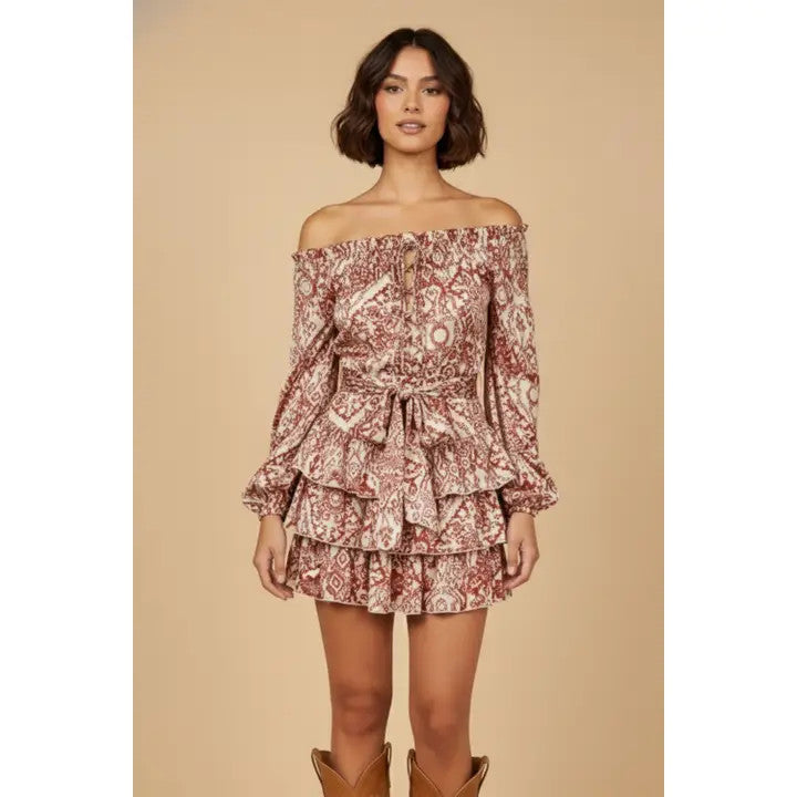 An effortlessly feminine off-the-shoulder mini designed to turn heads. Featuring a soft smocked neckline, long billowy sleeves, and a flattering adjustable waist tie, this dress is finished with layered ruffle tiers for the perfect touch of movement. The intricate boho-inspired print gives it a timeless yet elevated feel—perfect for brunch dates, vacation nights, or styled with boots for a chic western edge.