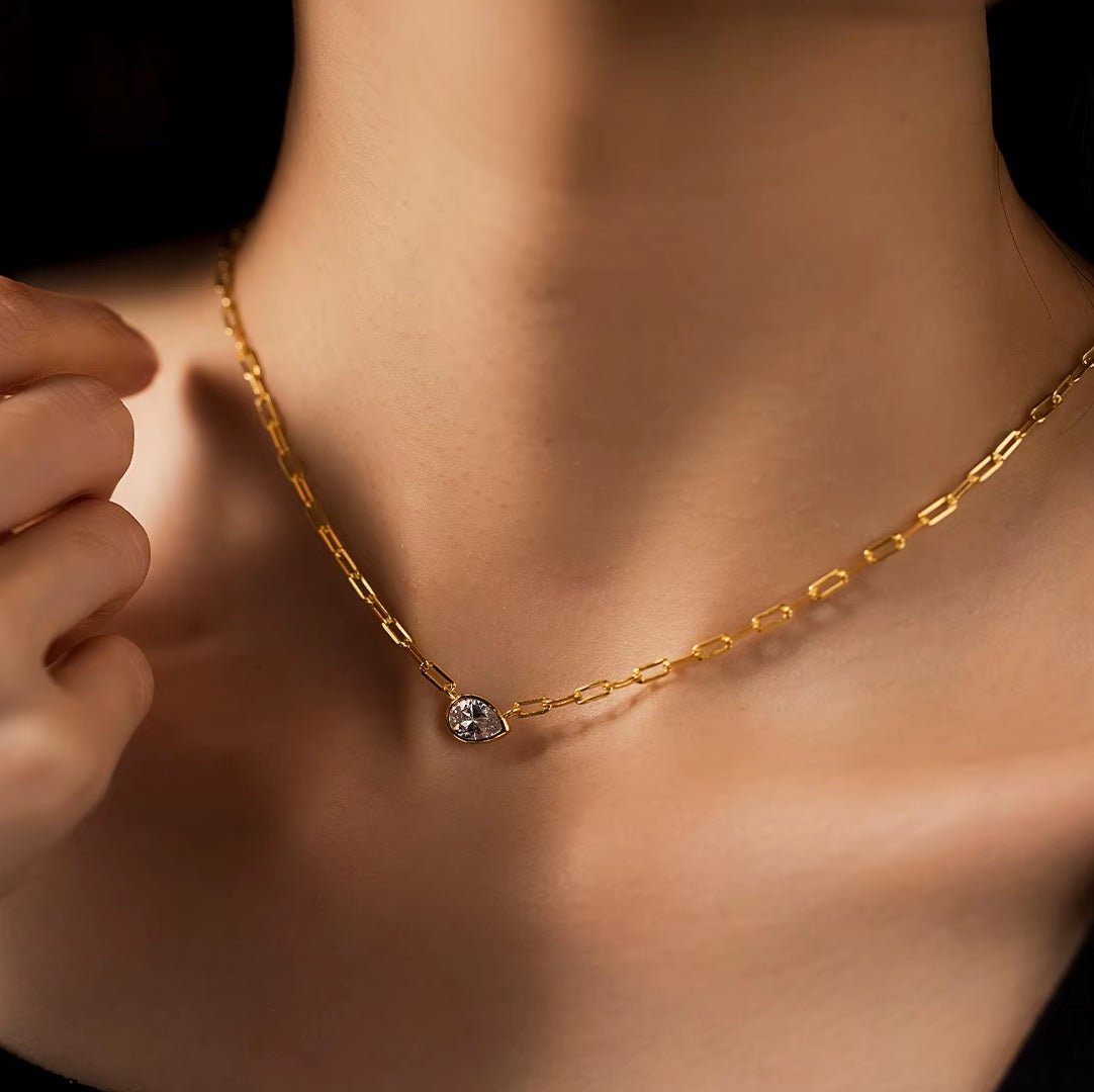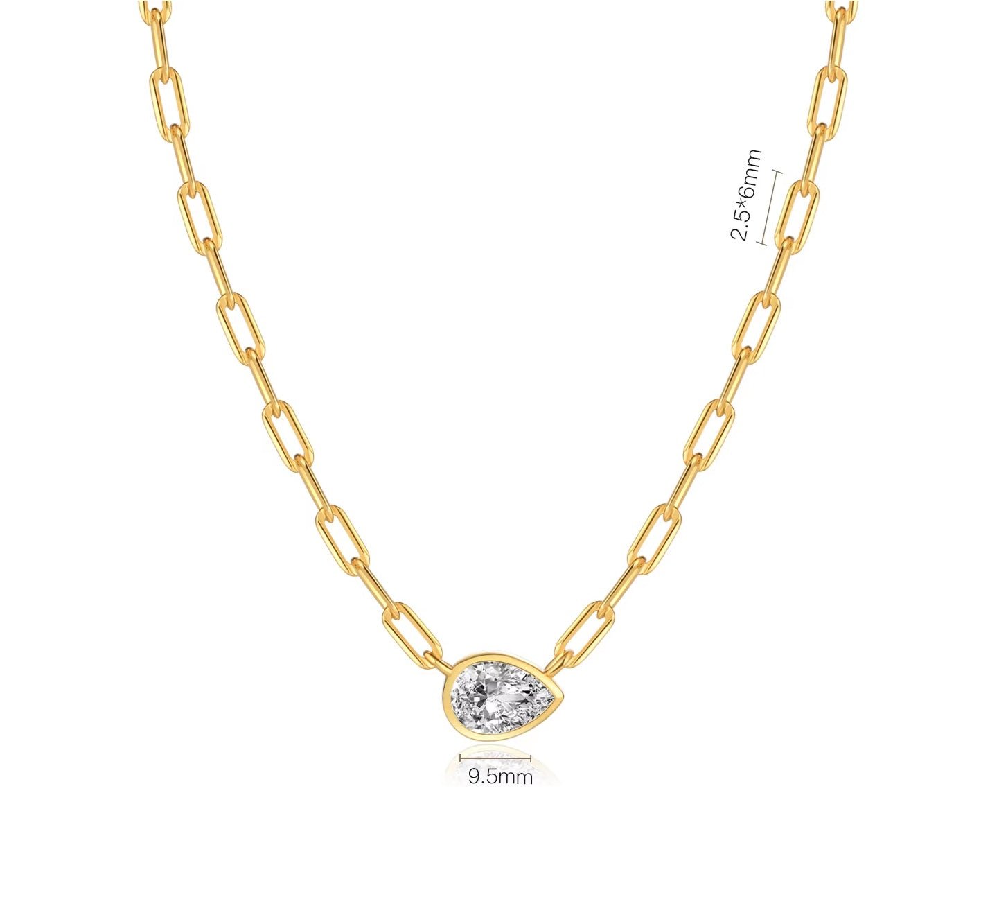Paperclip chain necklace crafted in sterling silver with a 14kt gold plating, and a bezel set pear shape cubic zirconia at center. Chain is 18" with a 2" extender.