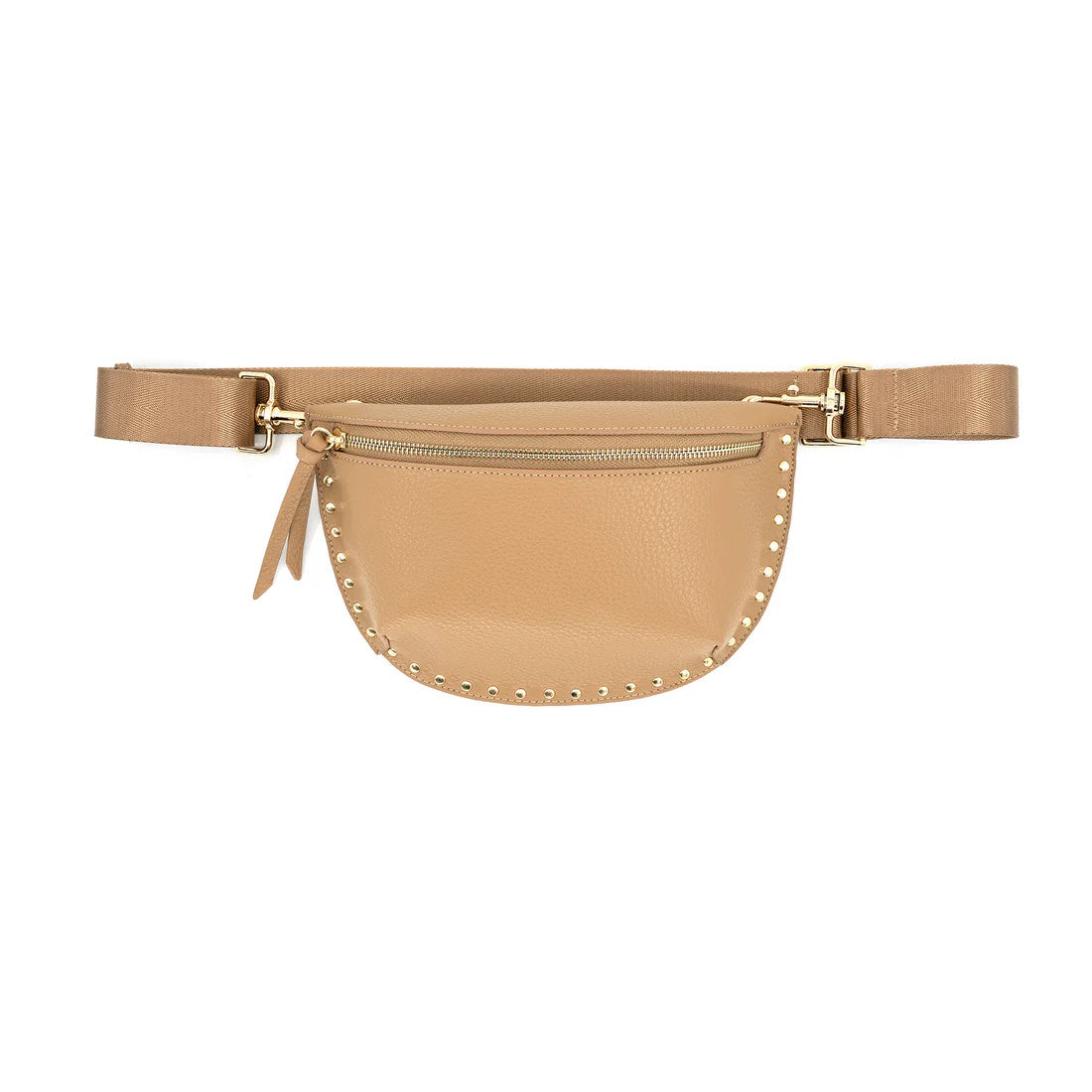 Crafted from smooth faux leather in a versatile tone, this belt bag is detailed with chic gold stud accents along the curved edge for a touch of modern edge. The zippered front closure keeps your essentials secure, while the adjustable strap allows for hands-free wear around the waist or across the body.