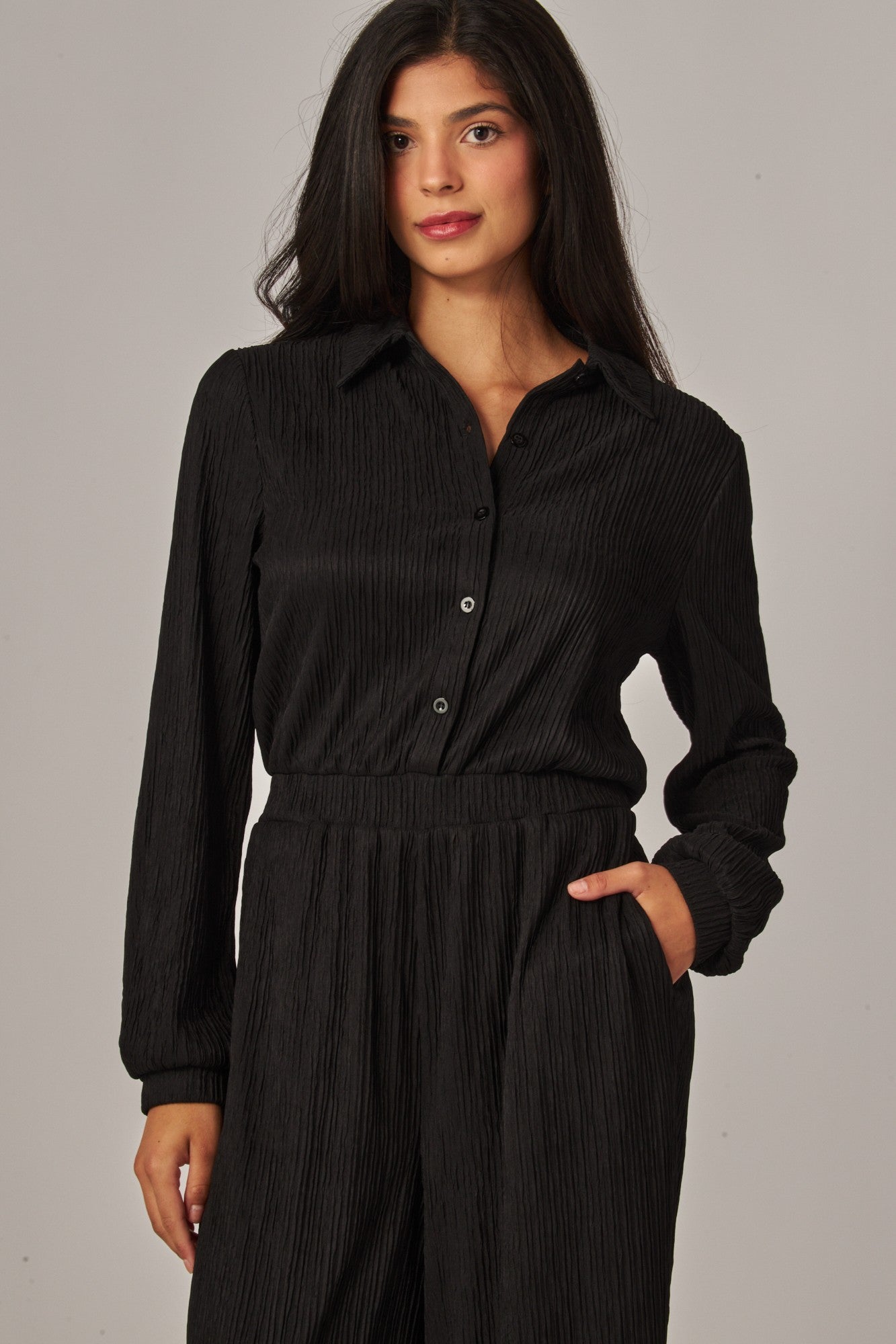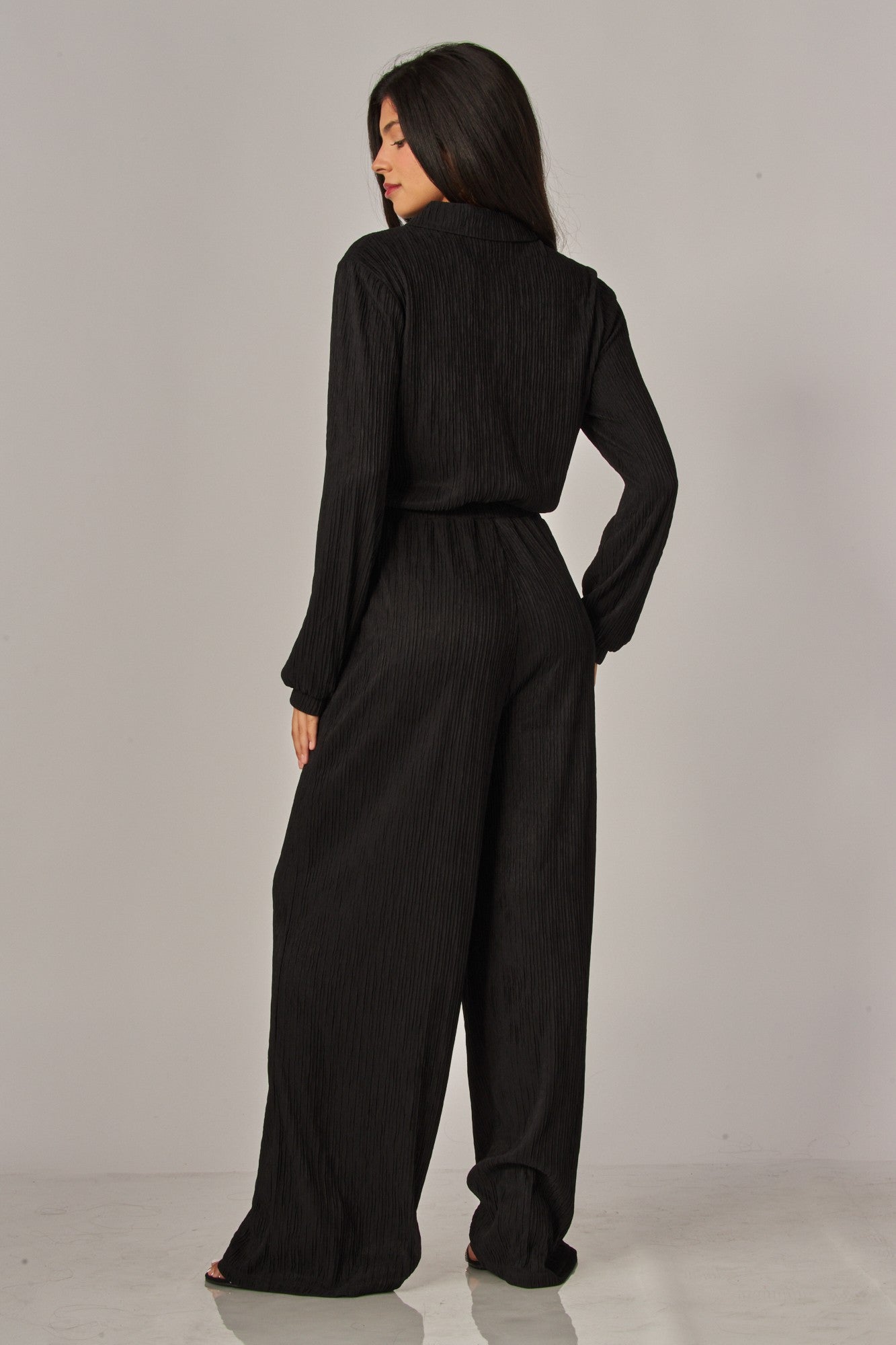 Made of our super soft crinkled plisse fabric. This jumpsuit has a shirt collar button up, wide legs, flap pockets and ready-to-roll sleeves. Warning: You'll literally want to wear this one every day.